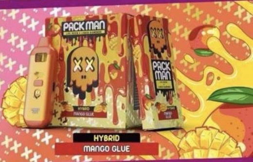 Packman Mango Glue Disposable, Mango glue is a pretty Indica-dominant hybrid strain (60% Indica/40% sativa) made via crossing the tasty ice cream Cake X Grape Zkittlez X Gelato 41 strains. If you are Packman carts looking for a well-balanced bud with a super taste flavor, you have found it with Packman mango glue. This bud brings remarkable tastes with every stroke, blending sweet fruits, fresh vanilla, and sour grapefruit. The aroma is just as tasty, with a bouquet of fresh berries and sour citrus accented by sharp cherry, flowery woods, and spicy vanilla. The Packman 2g Disposable Boutiq v3
